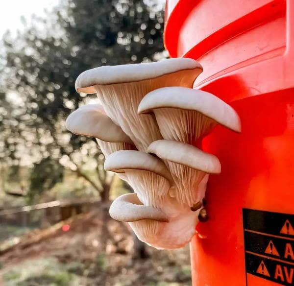 Blue oyster mushrooms can also be grown in more traditional garden beds or containers inoculated with grain or sawdust spawn. As outlined in our substrate compatibility guide, garden beds can be supplemented with various agricultural byproducts such as coffee grounds, grass clippings, leaf waste, straw, corn cobs, sawdust, banana leaves, cotton seed hulls, newspaper, and cardboard. When grown in beds or from containers blue oysters prefer straw over denser woody substrates such as wood chips but straw is preferable to hay as hay contains seed heads which are more prone to contamination. Straw bales or bagged chopped straw can be found at local garden centers, agricultural supply stores, or nearby farms. For a complete guide to growing mushrooms from buckets and containers please read our blog or watch our recent video!