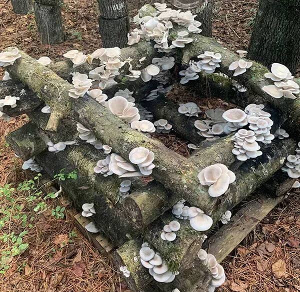 Blue oyster mushrooms growing in the typical style: dense, overlapping clusters of individual fungi