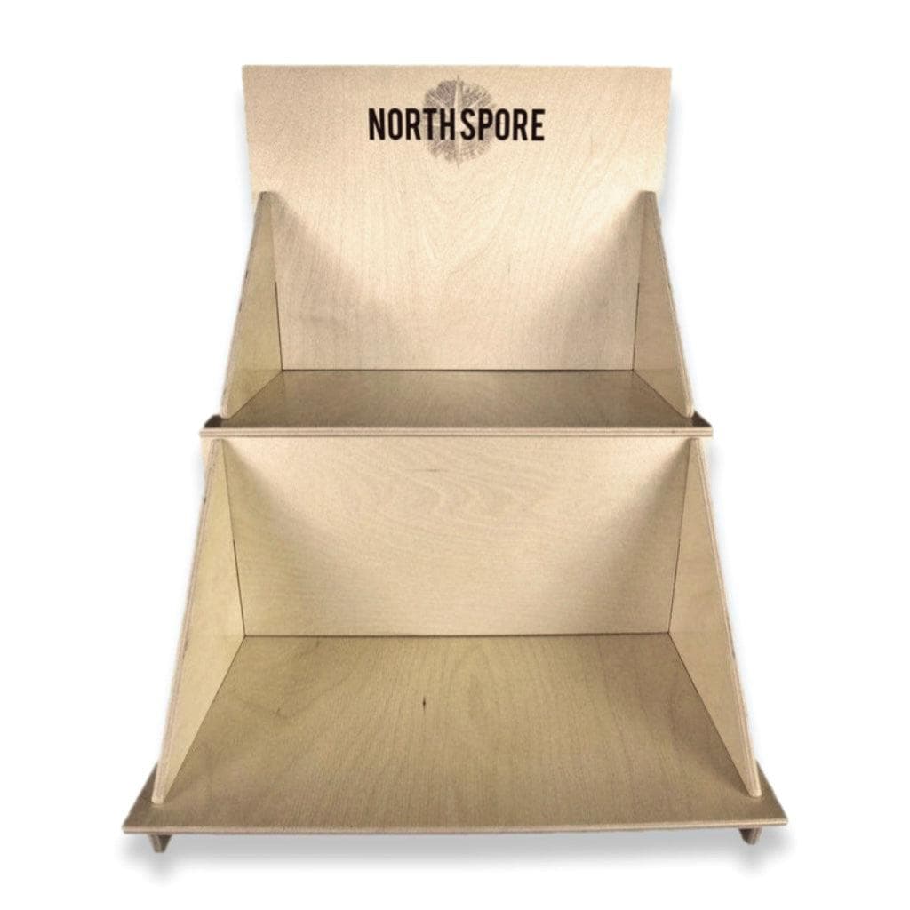 Our wooden countertop display was designed to fit 18 of our outdoor mushroom log kits, but can also be used for tinctures, and teas, dried mushrooms, and spray & grow kits. (Scroll through the photo carousel to see ideas for merchandising.)